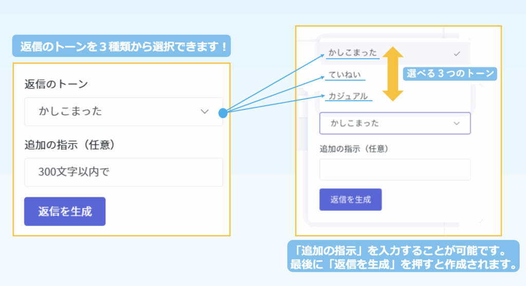 返信のトーン(文体)を「かしこまった」「ていねい」「カジュアル」の3種類から選ぶことができ、1つのトーンをデフォルトに設定することも可能です。デフォルトに設定しない場合、レビューによってトーンを変更することが可能です。