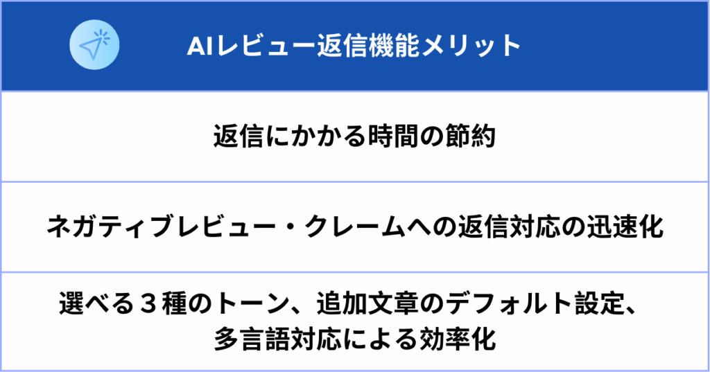 AIレビュー返信機能を導入することで、お客様から投稿されたレビューに返信する時間や返信にかかる工数を減らすことが可能です。
