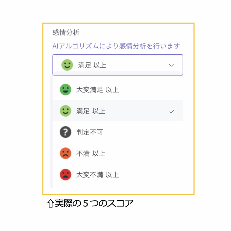 「大変満足 以上」「満足 以上」「判定不可」「不満 以上」「大変不満 以上」の5つから分析が行われ、それぞれ結果が管理画面にスコア表示されます。