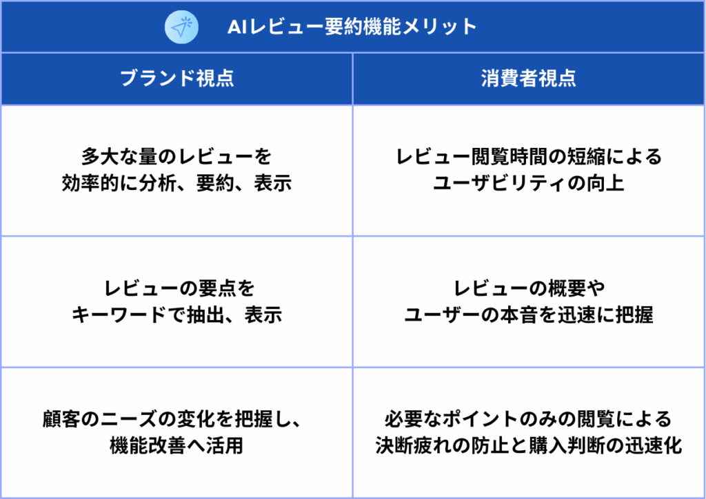 AIレビュー要約機能の導入によるメリットを、ブランド視点と消費者視点からそれぞれまとめると以下のように示すことができます。