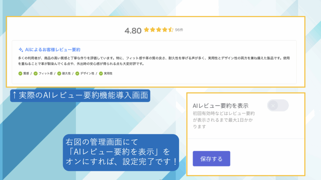 本機能は、U-KOMIの管理画面より「AIレビュー要約を表示」をONにするだけでご利用いただけます。