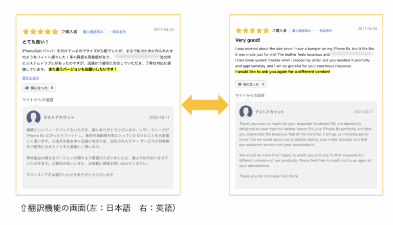 越境ECを運営するブランドやグローバル展開を目指すブランド、インバウンドを顧客とするブランドにとって、言語の壁はユーザビリティに大きく影響する課題となります。自動翻訳機能を導入することで、レビューをユーザーが指定した対象言語に翻訳することができ、ユーザーが翻訳検索する負担を減らすことができます。これにより、サイト訪問者の満足度とエンゲージメントが向上するだけでなく、顧客層の拡大につながると言えるでしょう。