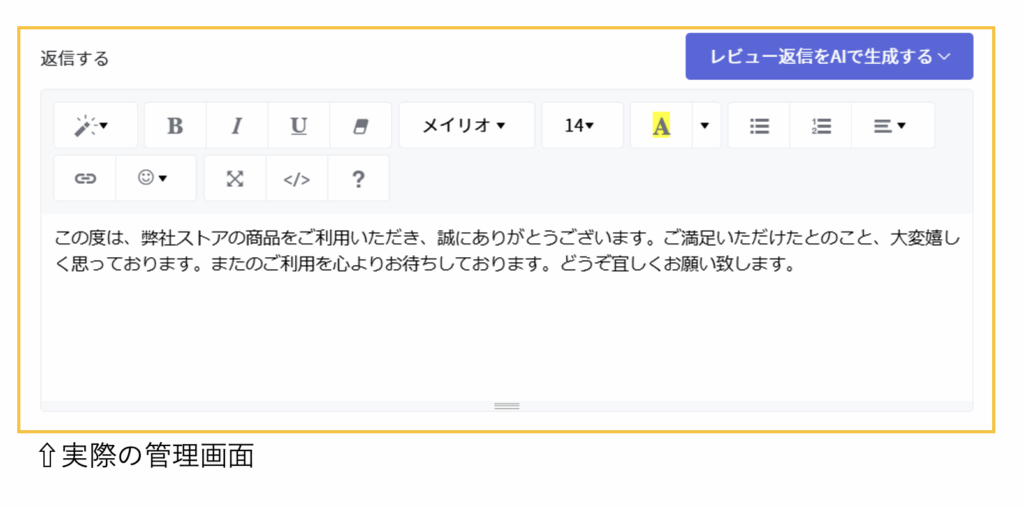 ネガティブレビューやクレームに対する返信なども自動で作成してくれるため、文章を考える時間を節約でき、より効率的に返信文を作成することができます。