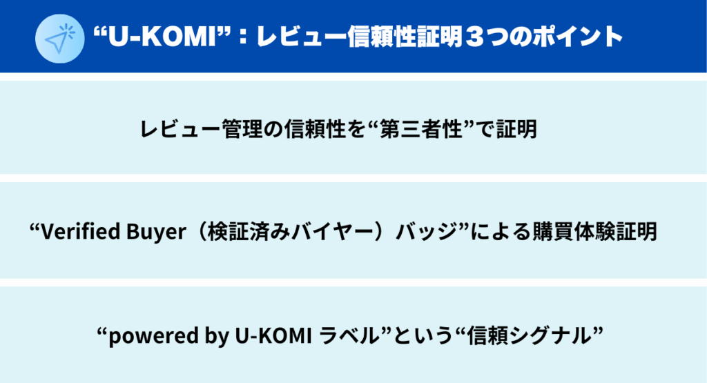 レビューは単なる装飾ではありません。「誰がどう収集したか」が重視される今、「U-KOMIを通じて収集されたレビュー」という構造そのものが信頼性を保証します。